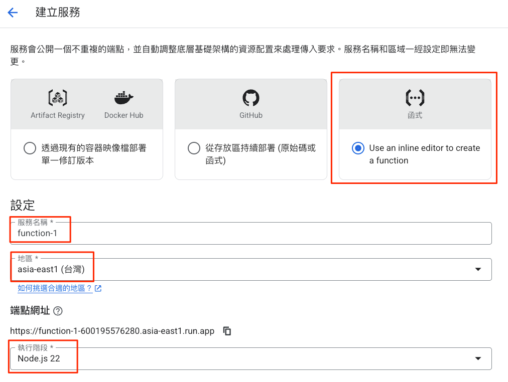 給函式命名、設定地區和程式語言版本,你看到它有產生一個端點網址,那就是之後對外服務的網址: