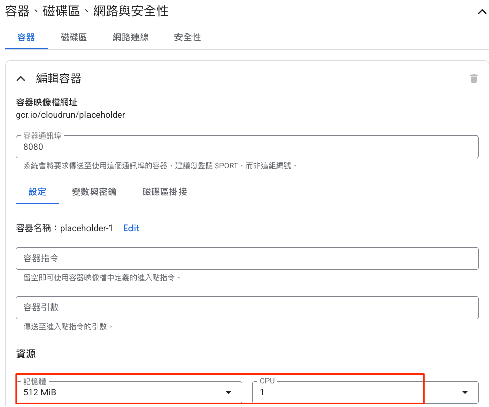 大部分內容都可以保持預設,主要看的是資源的部分,在正式的環境當中,你可以調整記憶體和 CPU 的規格,在這裡我們保持預設就好: