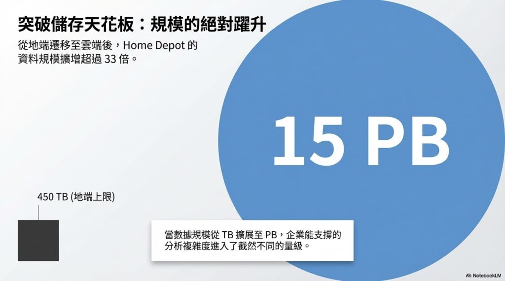 Google BigQuery 是 Google Cloud 提供的全託管、無伺服器雲端資料倉儲,企業無需管理基礎設施即可對 PB 級數據進行即時分析。 全球最大的居家裝修連鎖企業 Home Depot(家得寶)將傳統地端資料倉儲遷移至 BigQuery 後,供應鏈查詢時間從 8 小時壓縮至 5 分鐘,效能提升高達 99%。如果你正在評估企業是否應該導入 BigQuery,這篇文章提供了最具說服力的真實案例。