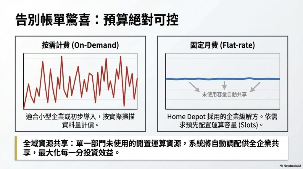 步驟 4:採用 Flat-rate 月費方案,控制預算可預測性 BigQuery 提供按查詢量計費與固定月費(Flat-rate)兩種計費模式。Home Depot 選擇固定月費,讓各部門可以依需求預算容量,未使用的資源也可供全企業共享,避免月底帳單暴增的驚喜。