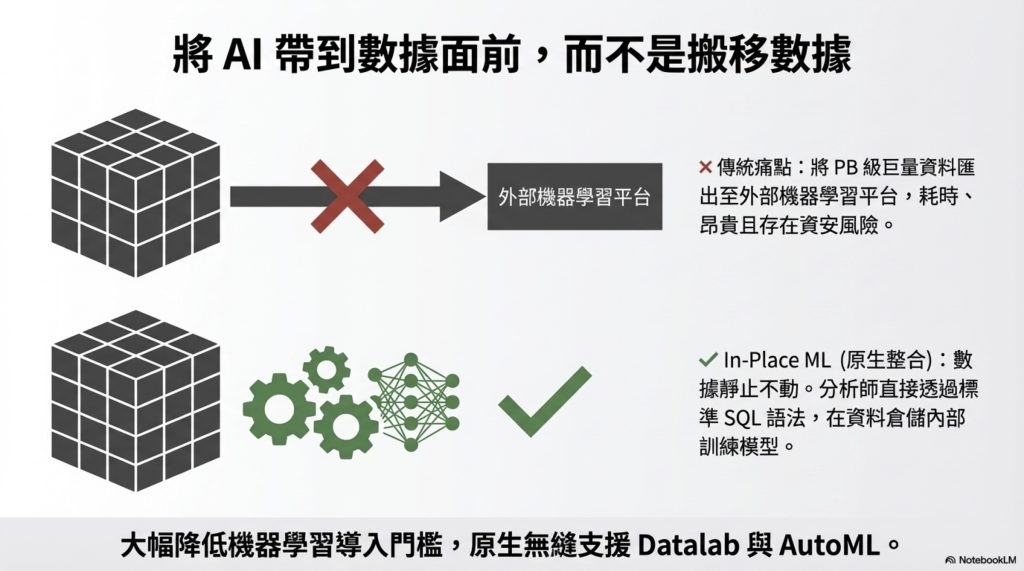 - 希望將 ML 模型訓練與數據倉儲整合,減少數據搬移成本