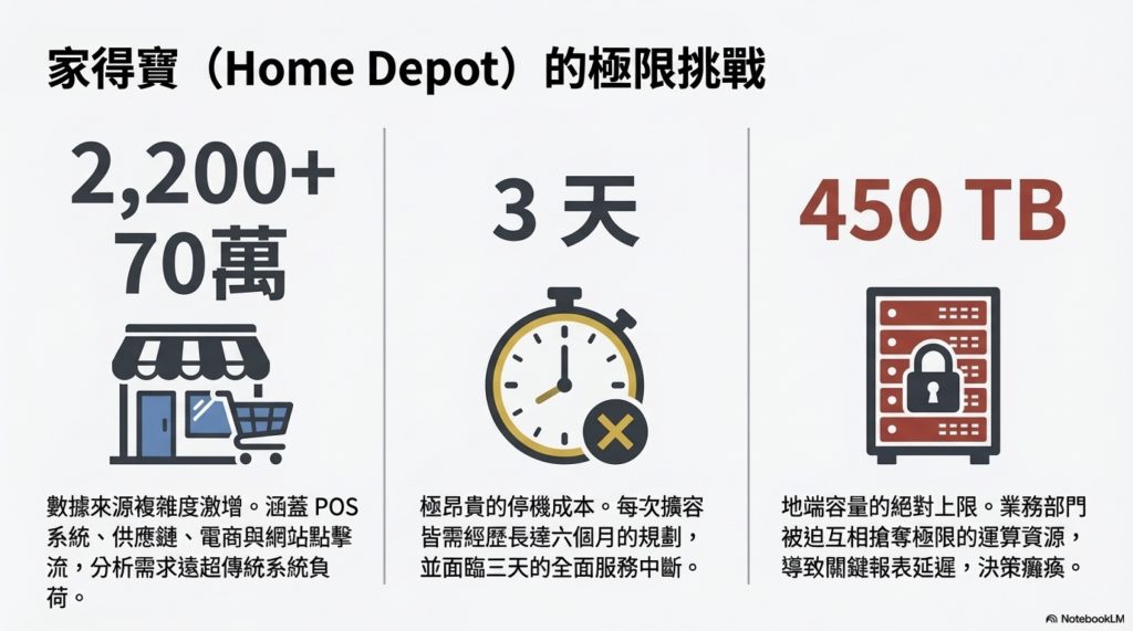 Home Depot 擁有超過 2,200 間門市、70 萬種商品品項,龐大的業務規模讓傳統資料倉儲不堪負荷。導入 BigQuery 之前,他們面臨以下困境: