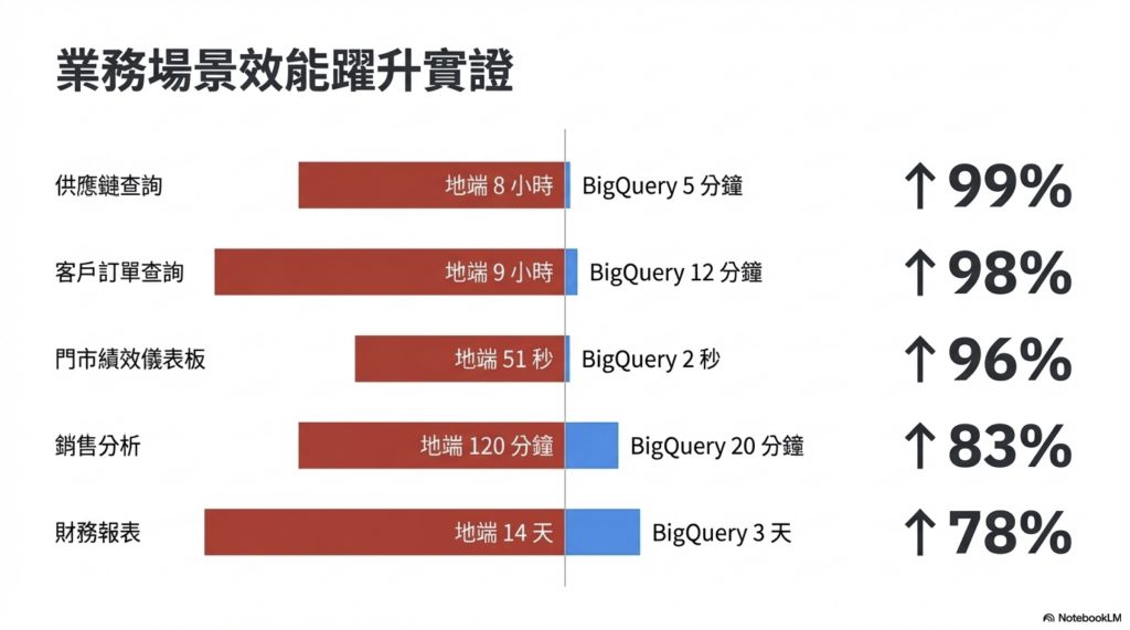 | 業務場景 | 地端系統耗時 | BigQuery 耗時 | 效能提升 |