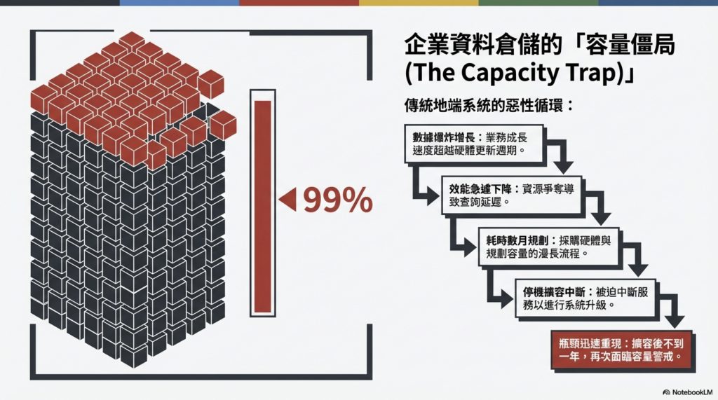 1. 擴容困難、停機成本極高 每次需要增加地端儲存容量,都要經歷六個月的規劃期與長達三天的服務中斷。即便如此,容量不到一年又告警示。這對 24 小時不間斷的零售業來說,是難以接受的風險。