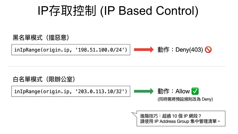 從最基本的 IP 封鎖和地理封鎖開始,再慢慢加入 WAF 預建規則集,觀察 Log,調整靈敏度。