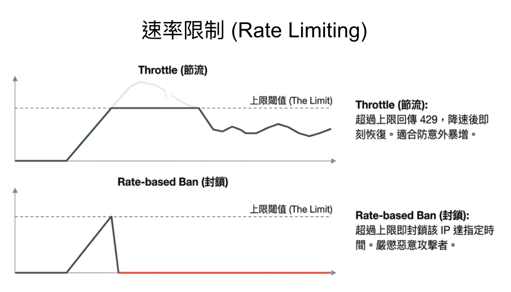 - HTTP Flood:透過速率限制,對單一 IP 的請求次數設上限