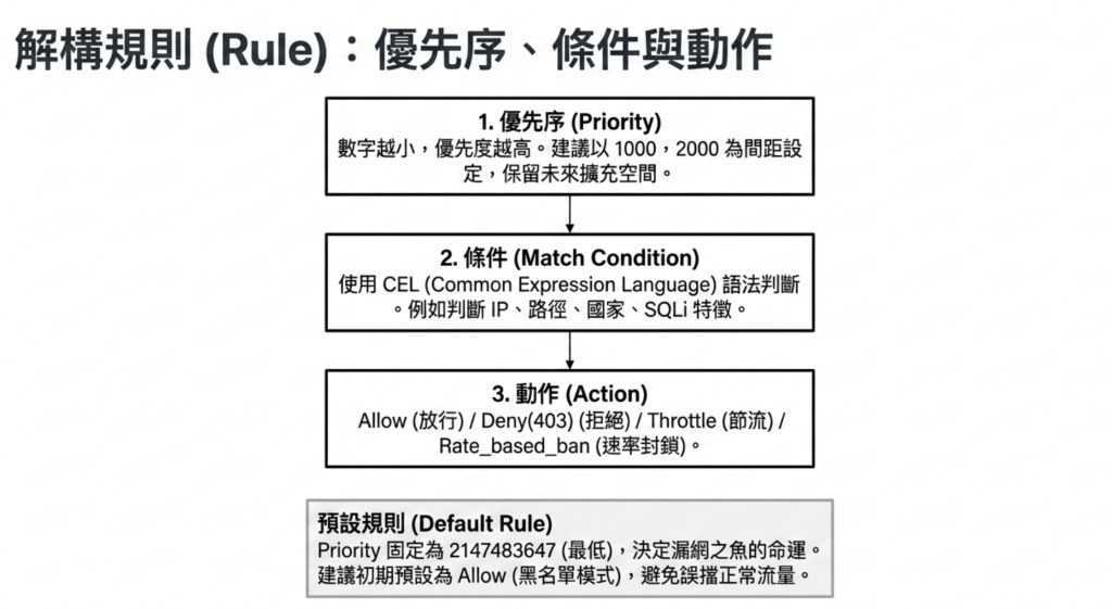 A:可以。在規則條件中加入 request.path 的判斷,例如 request.path.matches('/api/.*') 只對 API 路徑套用規則,其他路徑不受影響。這樣可以針對敏感端點設定嚴格規則,同時不影響靜態資源的存取速度。