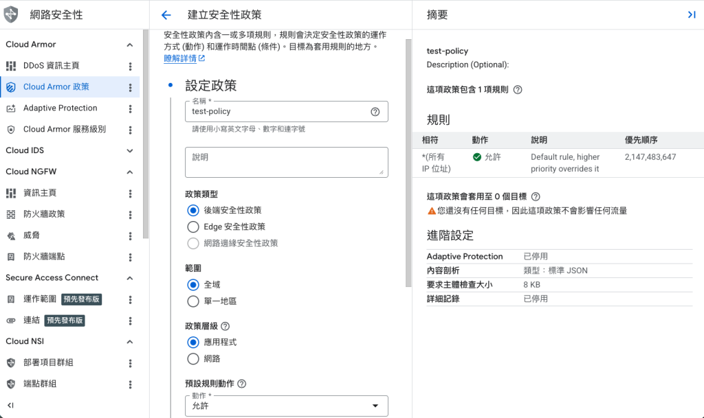 - 確認安全政策有套用到後端服務:前往 Cloud Armor → 點進你的政策 → 查看「Targets」分頁,確認你的 Backend Service 在清單中