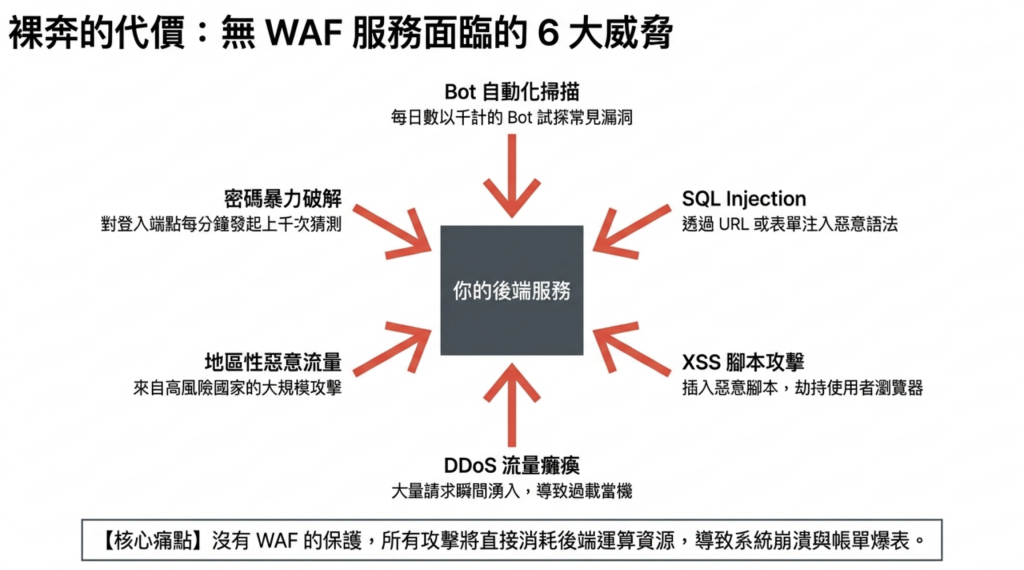 如果沒有 WAF,這些攻擊會直接打到你的後端,讓你的 VM 或容器承受無效請求,耗費運算資源,也增加被攻破的風險。
