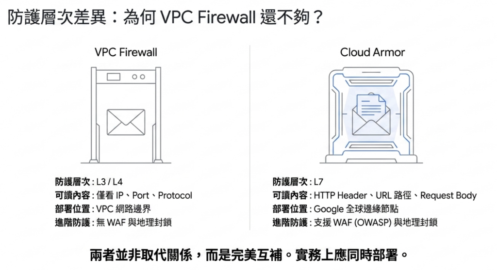 很多人第一次接觸 GCP Cloud Armor 時會問:「GCP 不是已經有 VPC Firewall 了嗎?為什麼還需要 Cloud Armor?」